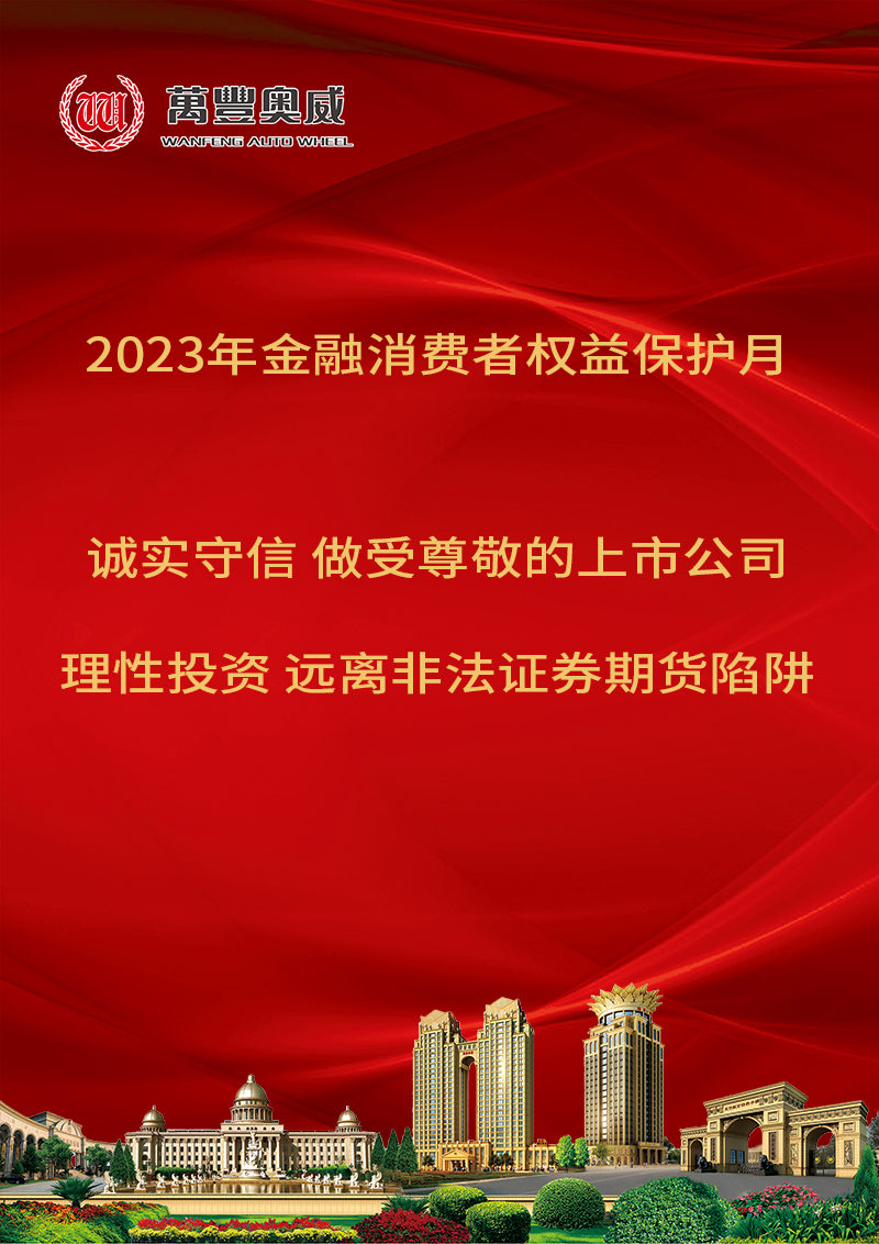 為提升消費者金融素養,增強金融安全意識,促進(jìn)市場(chǎng)公平有序,在中國人民銀行、銀保監會(huì )、證監會(huì )、網(wǎng)信辦的統一部署下,萬(wàn)豐奧威積極響應監管要求,開(kāi)展2023年“匯聚金融力量 共創(chuàng )美好生活”金融消費者權益保護月活動(dòng)。 宣傳口號為“誠實(shí)守信 做受尊敬的上市公司 理性投資 遠離非法證券期貨陷阱”。